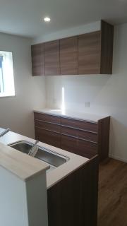 何といっても水ほうき水栓で大きなお鍋も手早く効率的に洗うことができます。背面収納にウォールキャビネットもつけ、たっぷりの収納力です。
